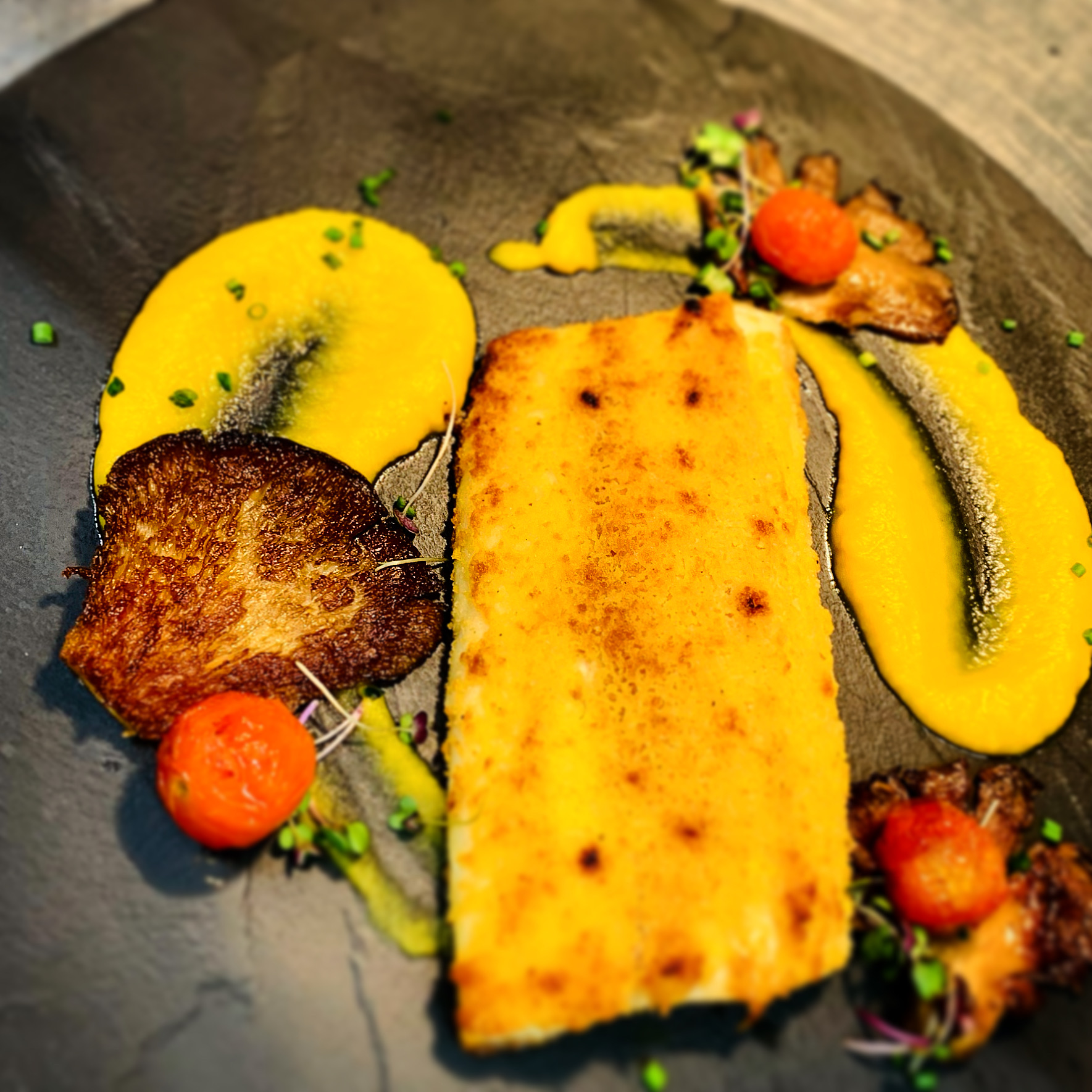 Perfekt gegartes Kabeljau-Filet, gratiniert mit einer sanften Knoblauch-