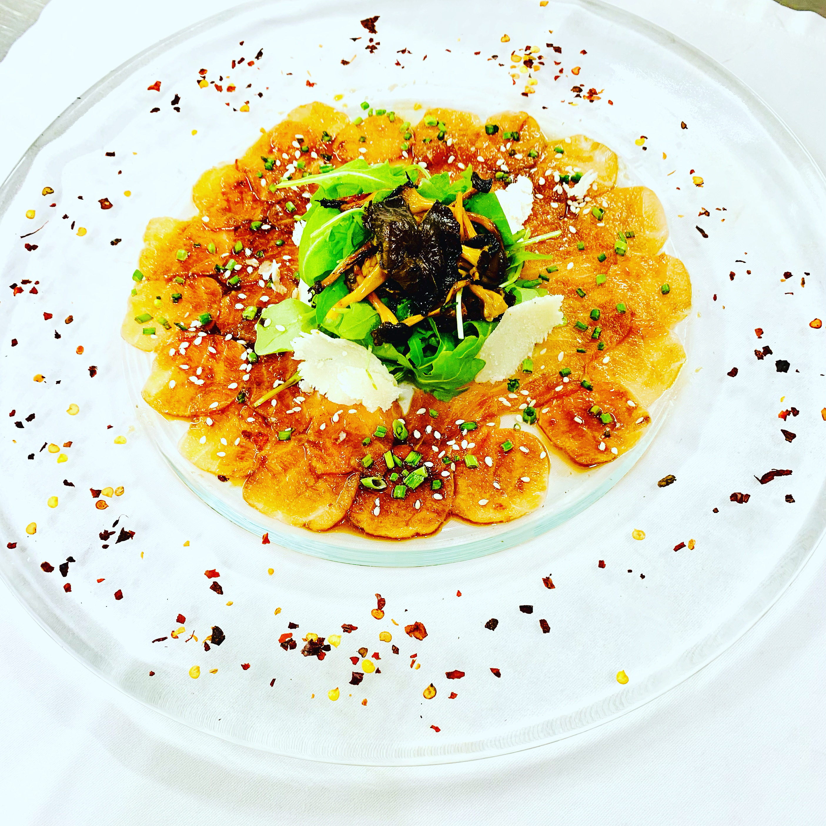 A delicate tartare of fresh Mediterranean prawns with citrus essence, coconut